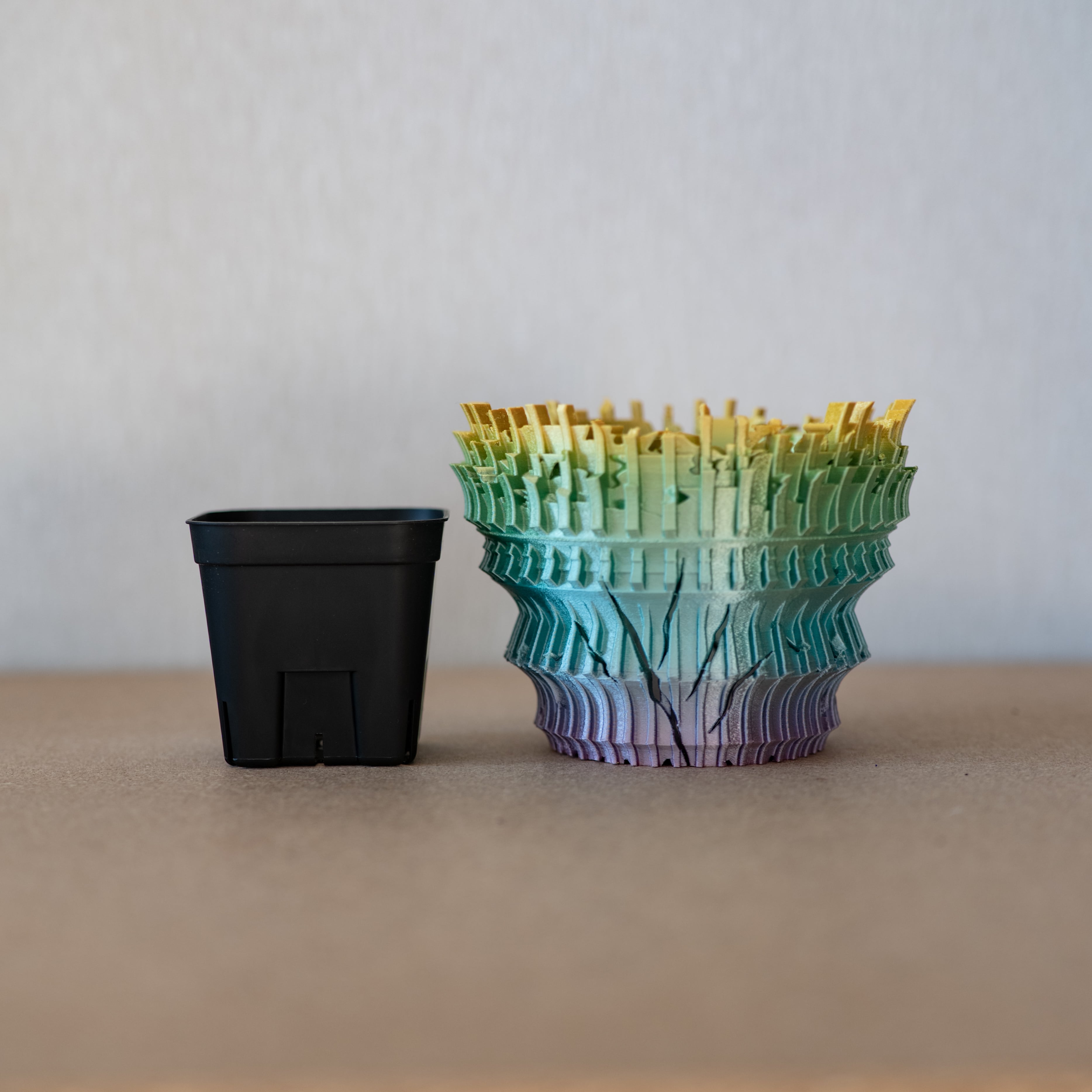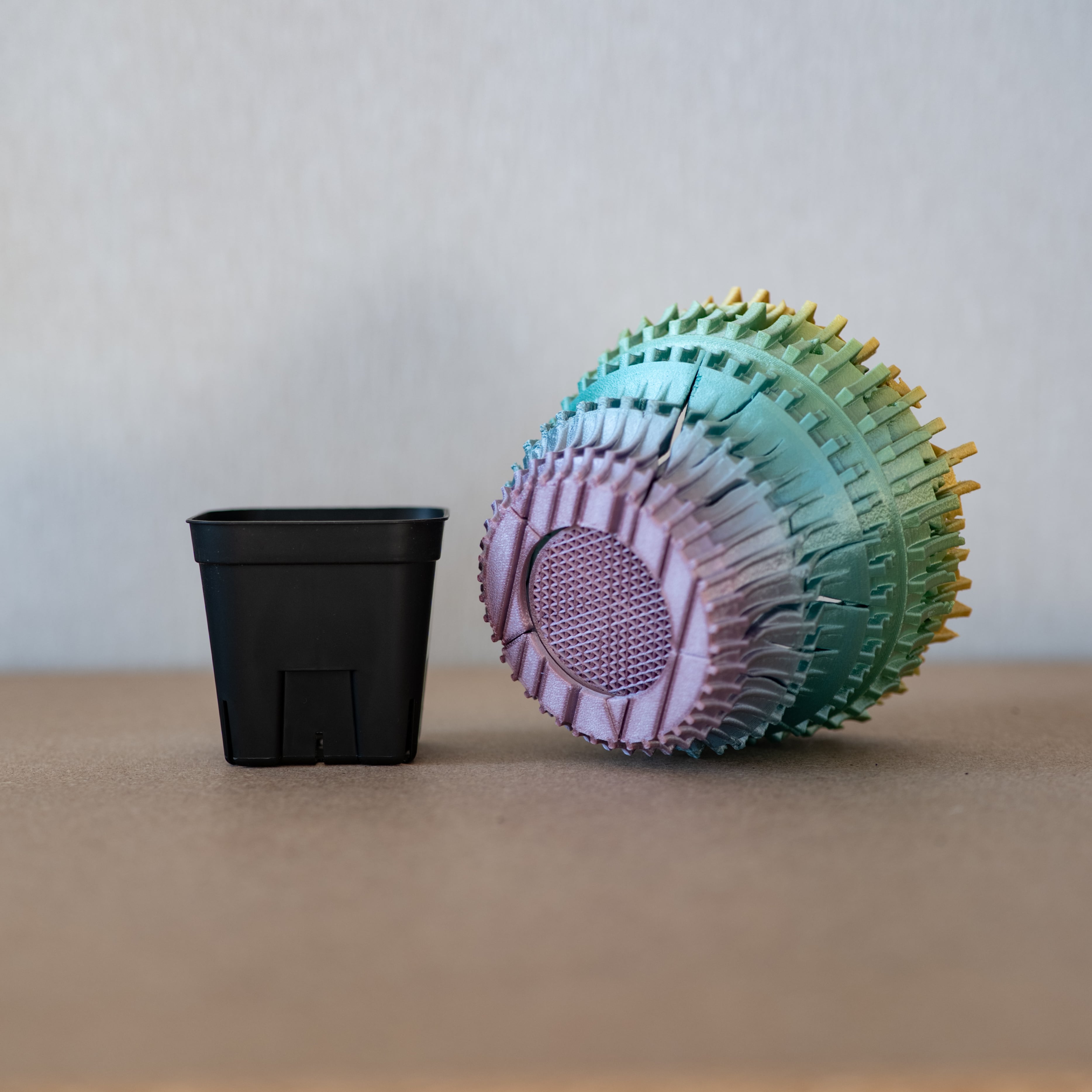 陶器鉢のような不規則性と3Dプリンターならではの精密なディテールを融合。全面スリットとサークリング防止のリブを設け、視覚的な美しさと優れた機能性を実現しています。