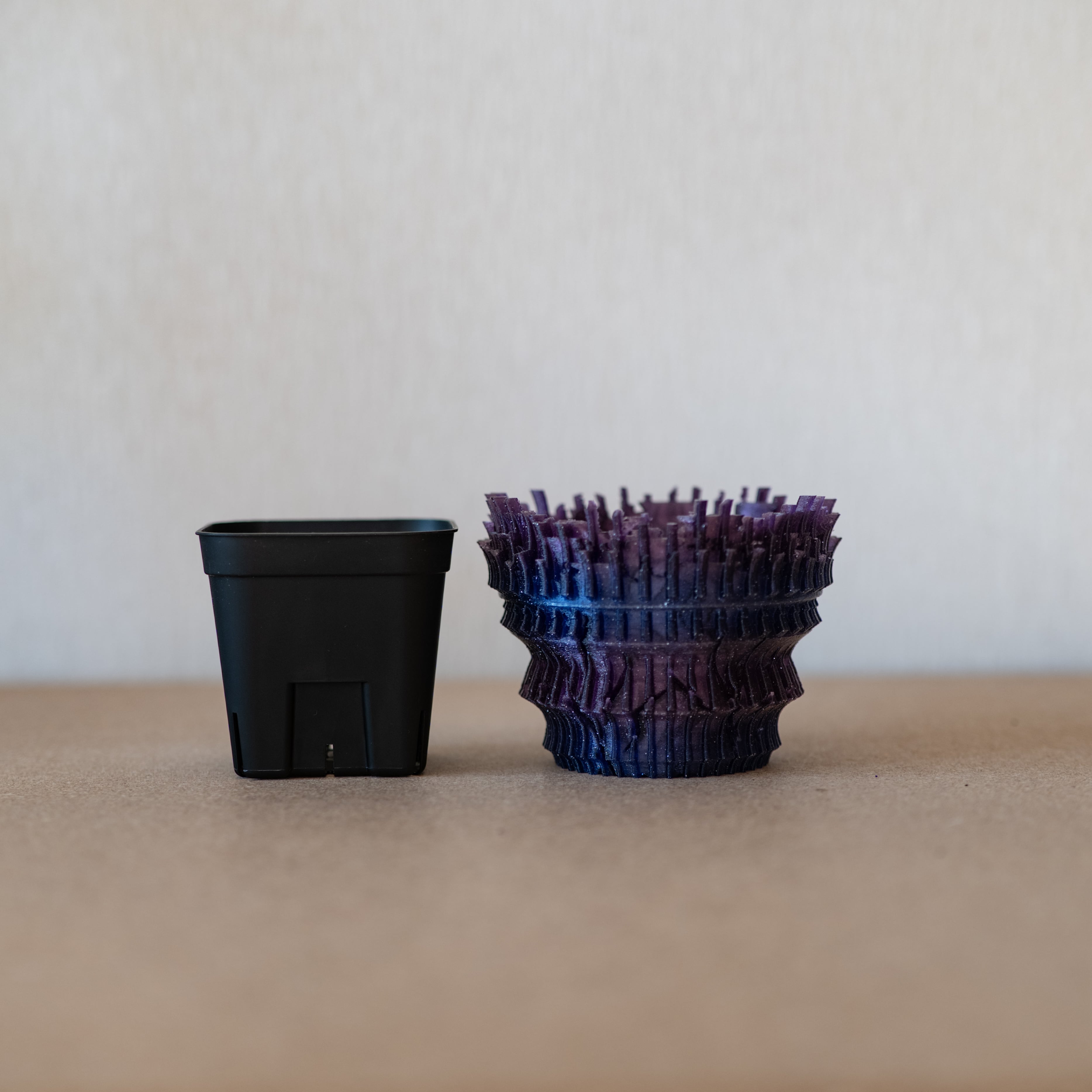 陶器鉢のような不規則性と3Dプリンターならではの精密なディテールを融合。全面スリットとサークリング防止のリブを設け、視覚的な美しさと優れた機能性を実現しています。