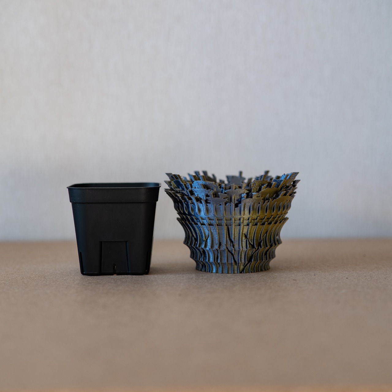 陶器鉢のような不規則性と3Dプリンターならではの精密なディテールを融合。全面スリットとサークリング防止のリブを設け、視覚的な美しさと優れた機能性を実現しています。