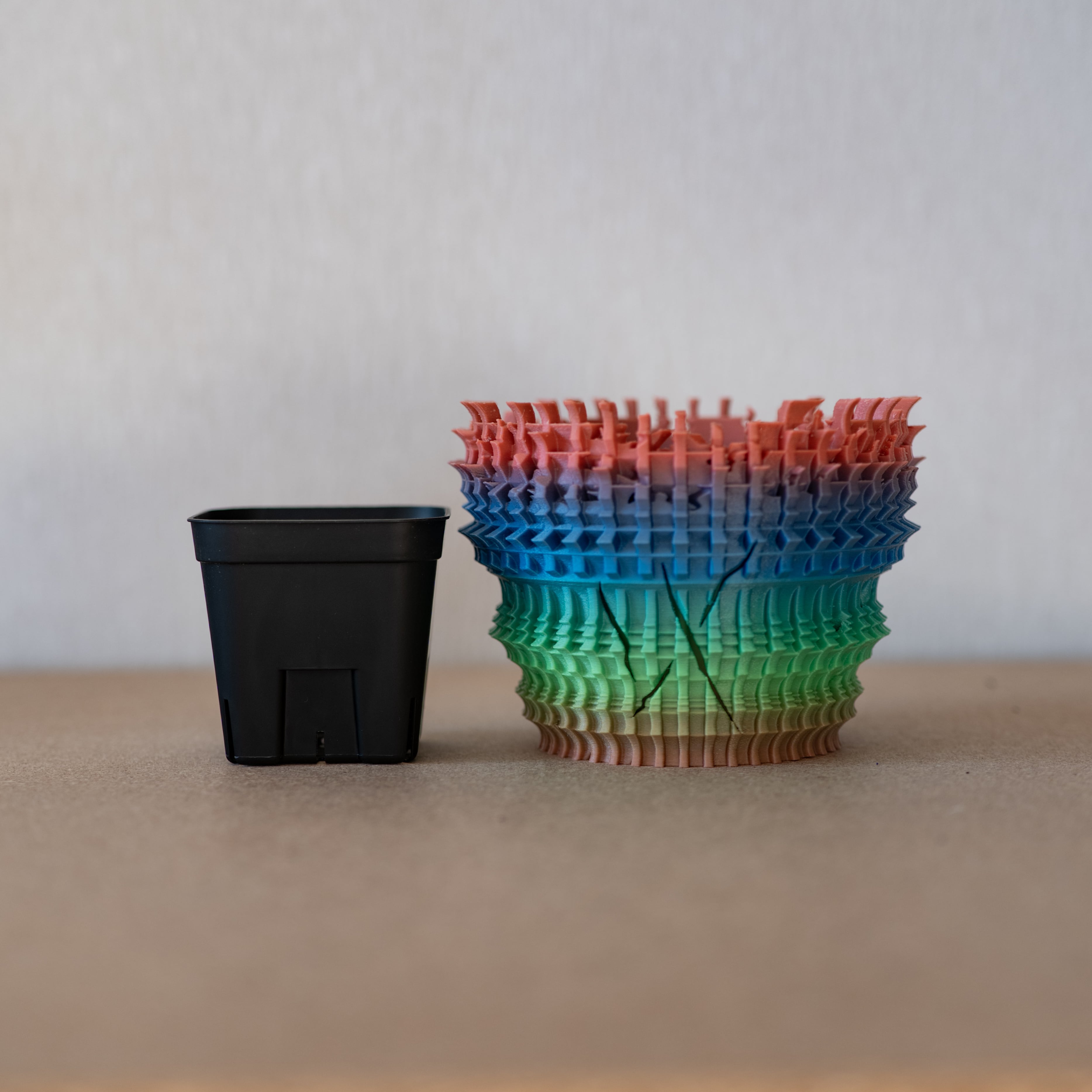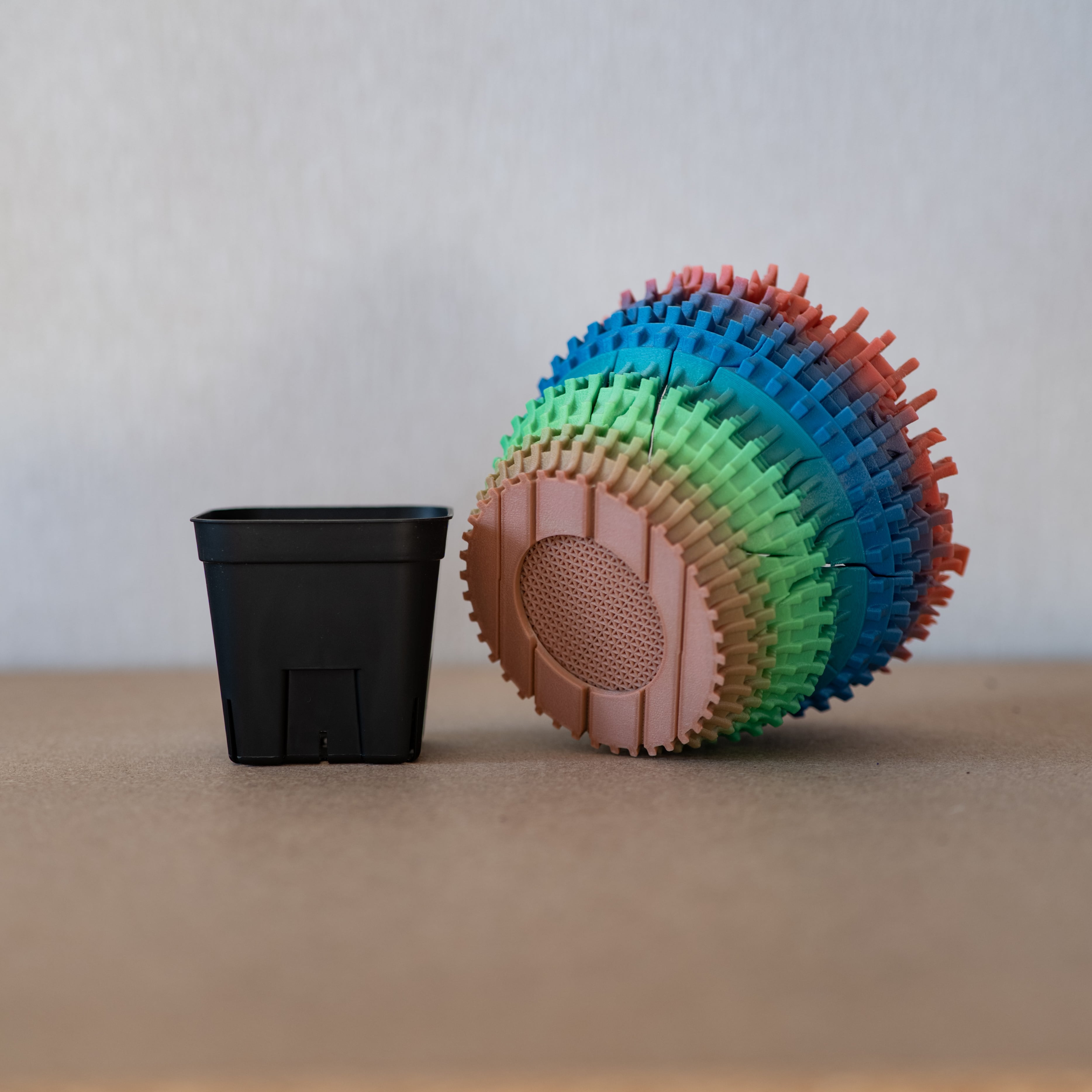 陶器鉢のような不規則性と3Dプリンターならではの精密なディテールを融合。全面スリットとサークリング防止のリブを設け、視覚的な美しさと優れた機能性を実現しています。