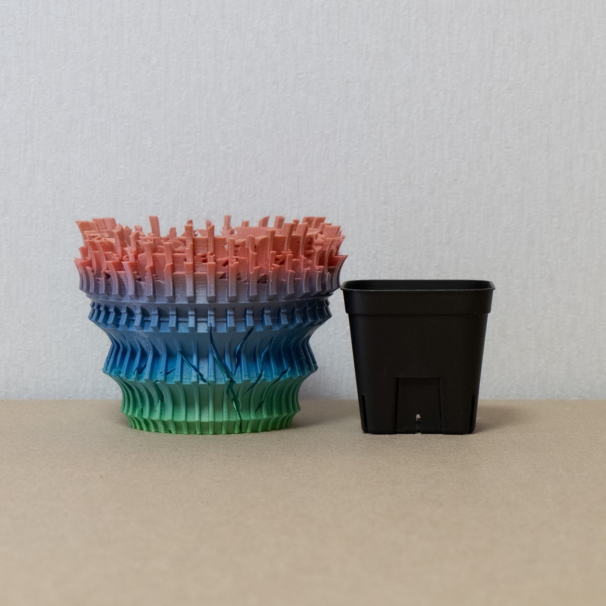 陶器鉢のような不規則性と3Dプリンターならではの精密なディテールを融合。全面スリットとサークリング防止のリブを設け、視覚的な美しさと優れた機能性を実現しています。