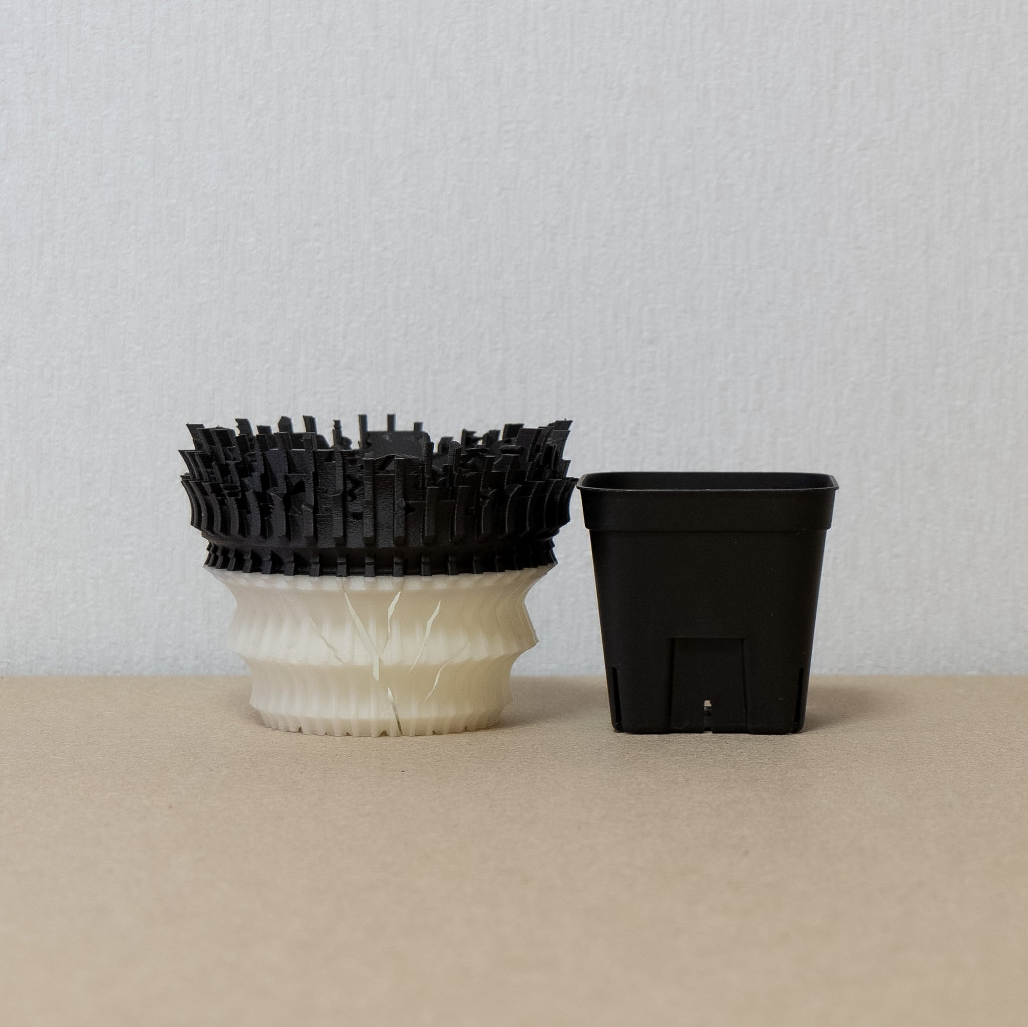 陶器鉢のような不規則性と3Dプリンターならではの精密なディテールを融合。全面スリットとサークリング防止のリブを設け、視覚的な美しさと優れた機能性を実現しています。
