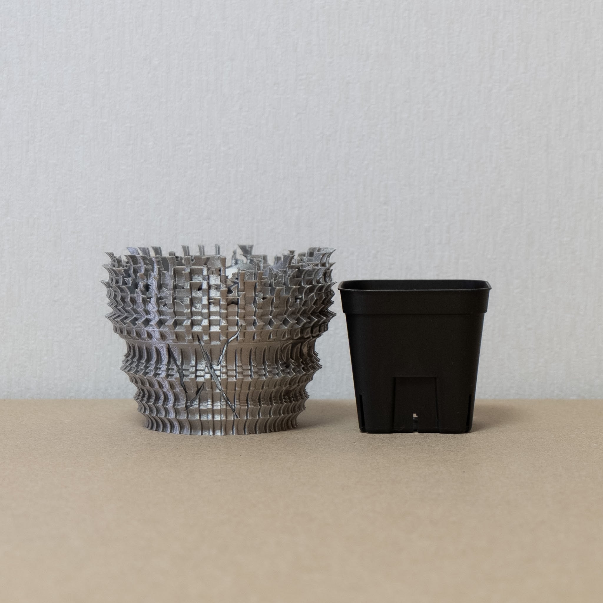 陶器鉢のような不規則性と3Dプリンターならではの精密なディテールを融合。全面スリットとサークリング防止のリブを設け、視覚的な美しさと優れた機能性を実現しています。