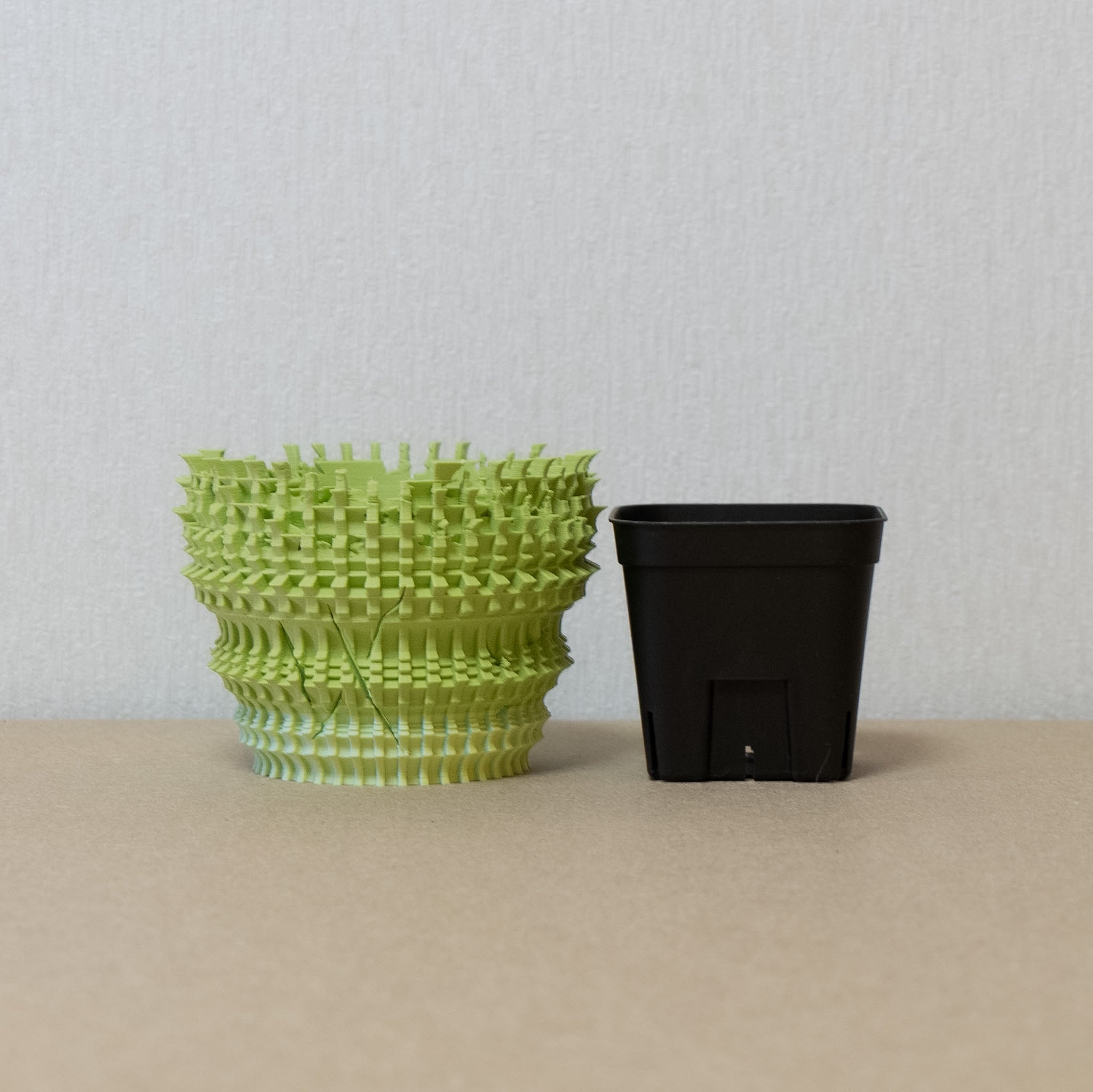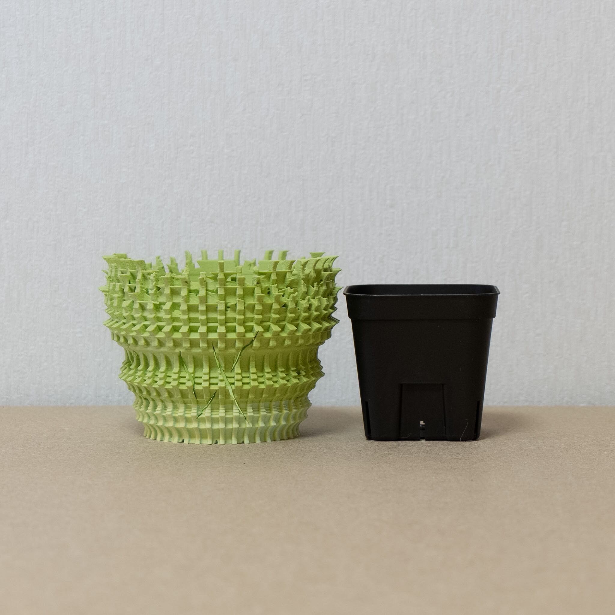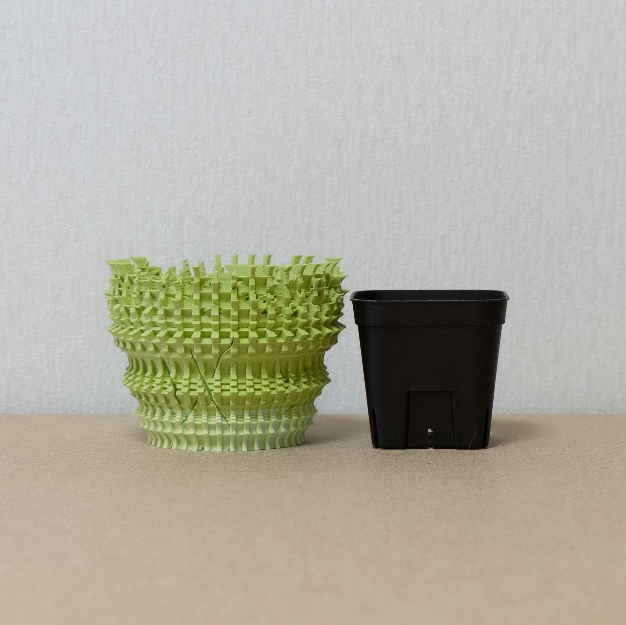 陶器鉢のような不規則性と3Dプリンターならではの精密なディテールを融合。全面スリットとサークリング防止のリブを設け、視覚的な美しさと優れた機能性を実現しています。