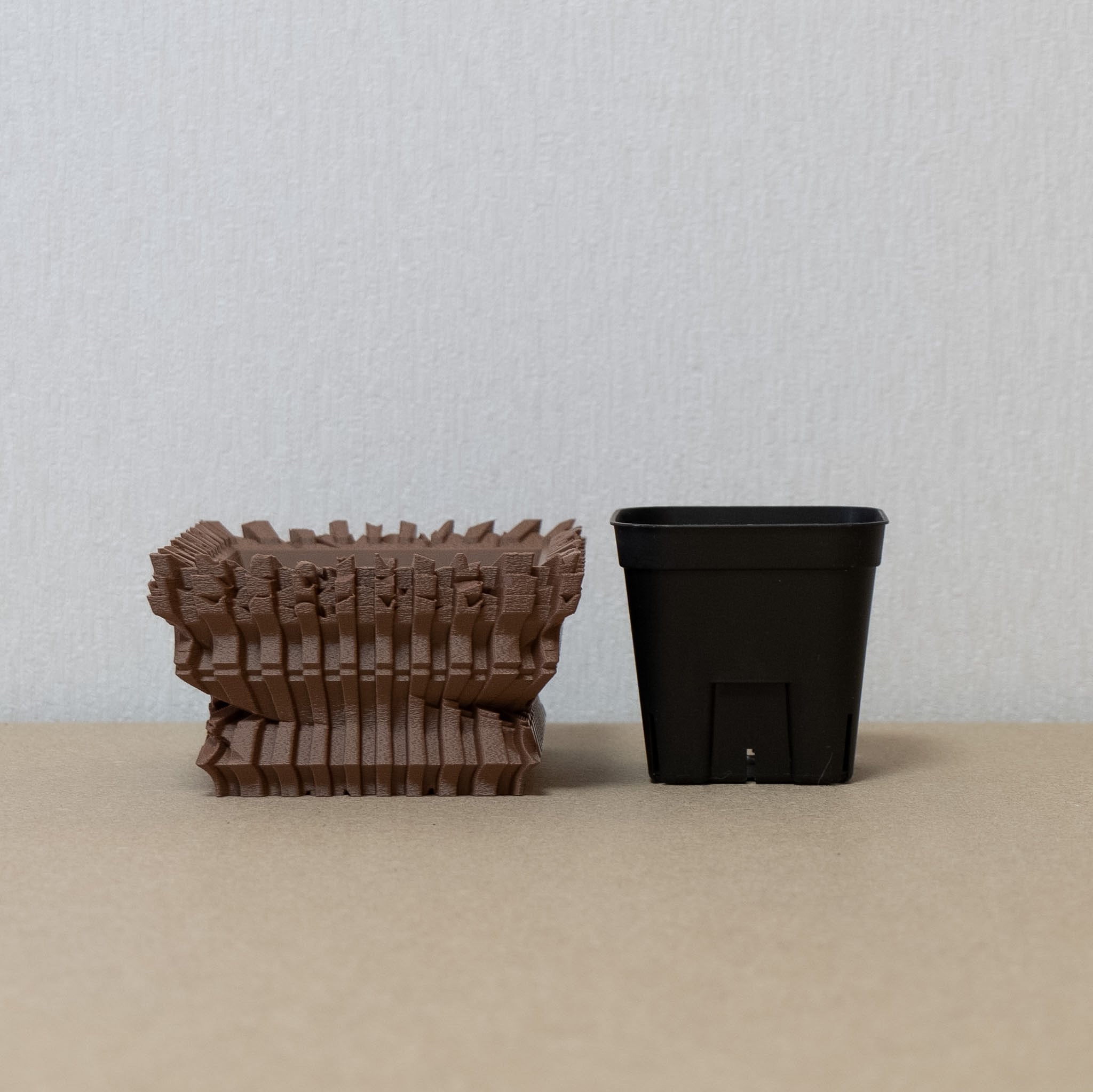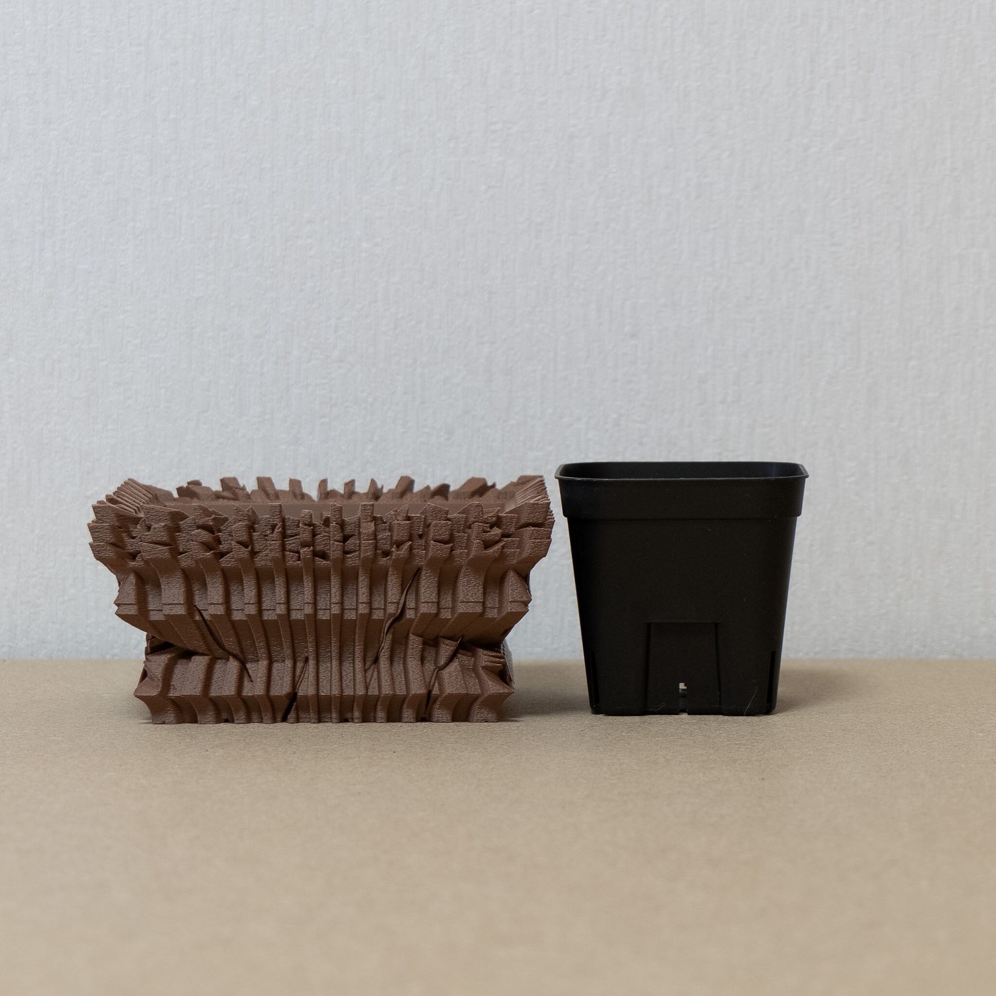 陶器鉢のような不規則性と3Dプリンターならではの精密なディテールを融合。全面スリットとサークリング防止のリブを設け、視覚的な美しさと優れた機能性を実現しています。