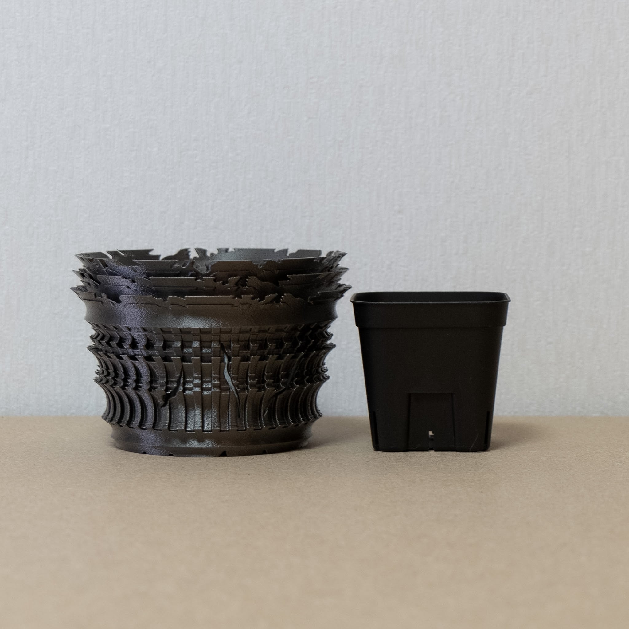 陶器鉢のような不規則性と3Dプリンターならではの精密なディテールを融合。全面スリットとサークリング防止のリブを設け、視覚的な美しさと優れた機能性を実現しています。