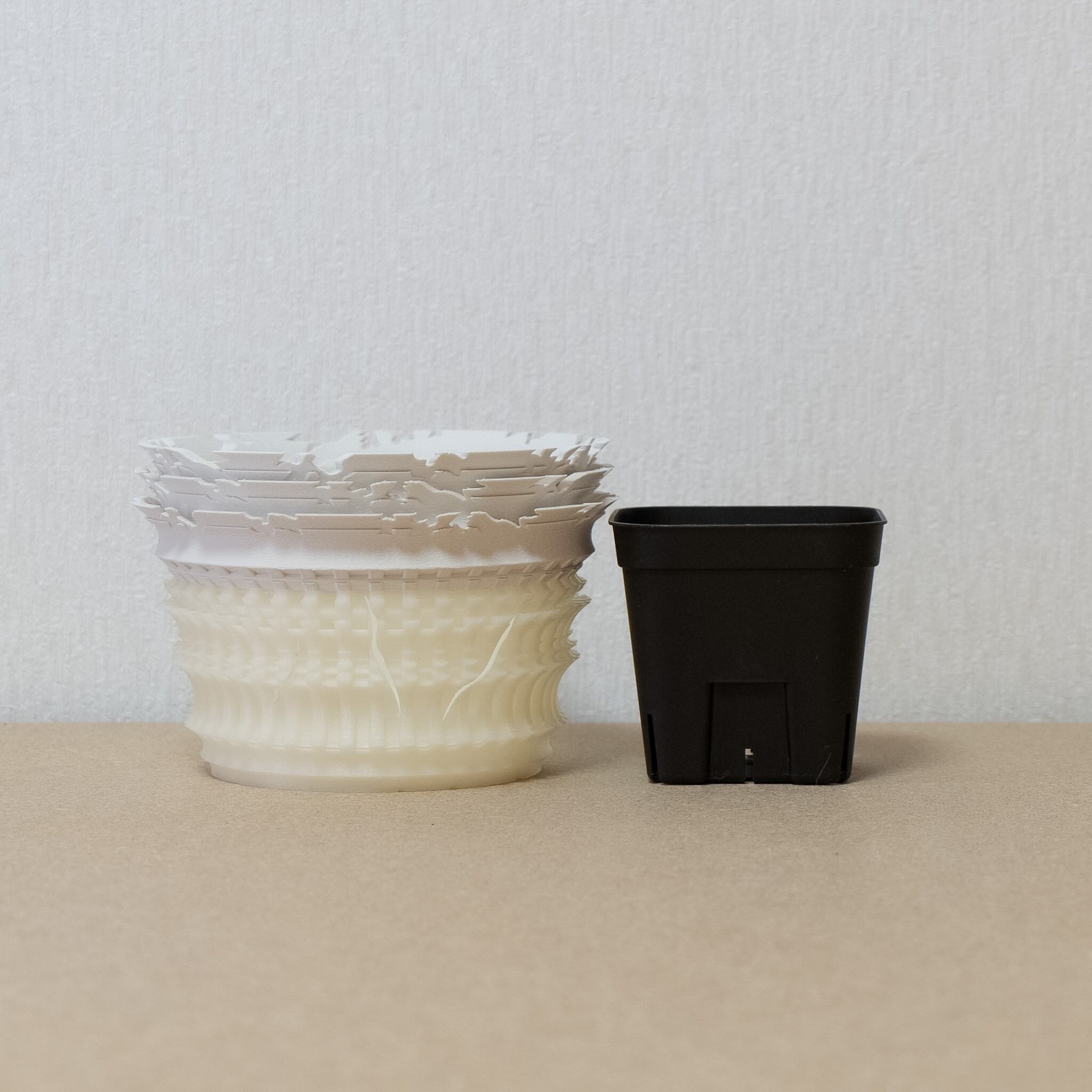 陶器鉢のような不規則性と3Dプリンターならではの精密なディテールを融合。全面スリットとサークリング防止のリブを設け、視覚的な美しさと優れた機能性を実現しています。