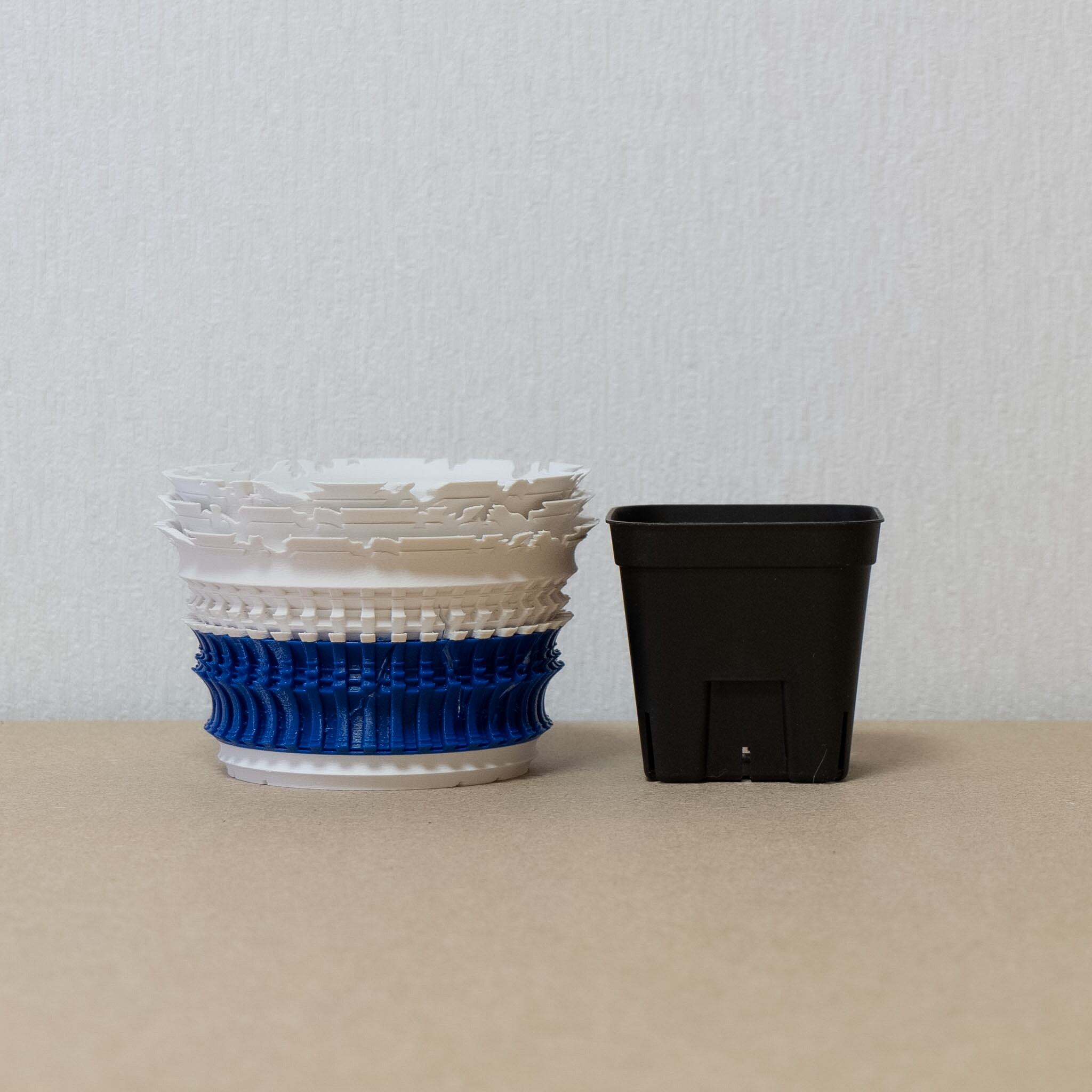 陶器鉢のような不規則性と3Dプリンターならではの精密なディテールを融合。全面スリットとサークリング防止のリブを設け、視覚的な美しさと優れた機能性を実現しています。