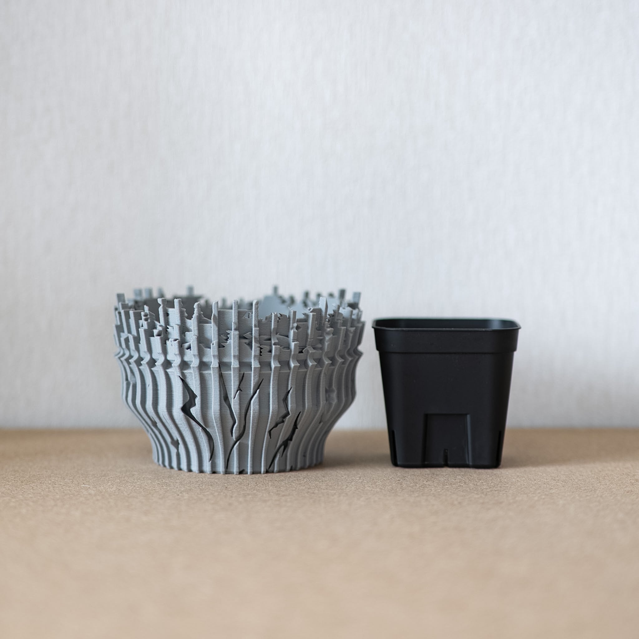 陶器鉢のような不規則性と3Dプリンターならではの精密なディテールを融合。全面スリットとサークリング防止のリブを設け、視覚的な美しさと優れた機能性を実現しています。