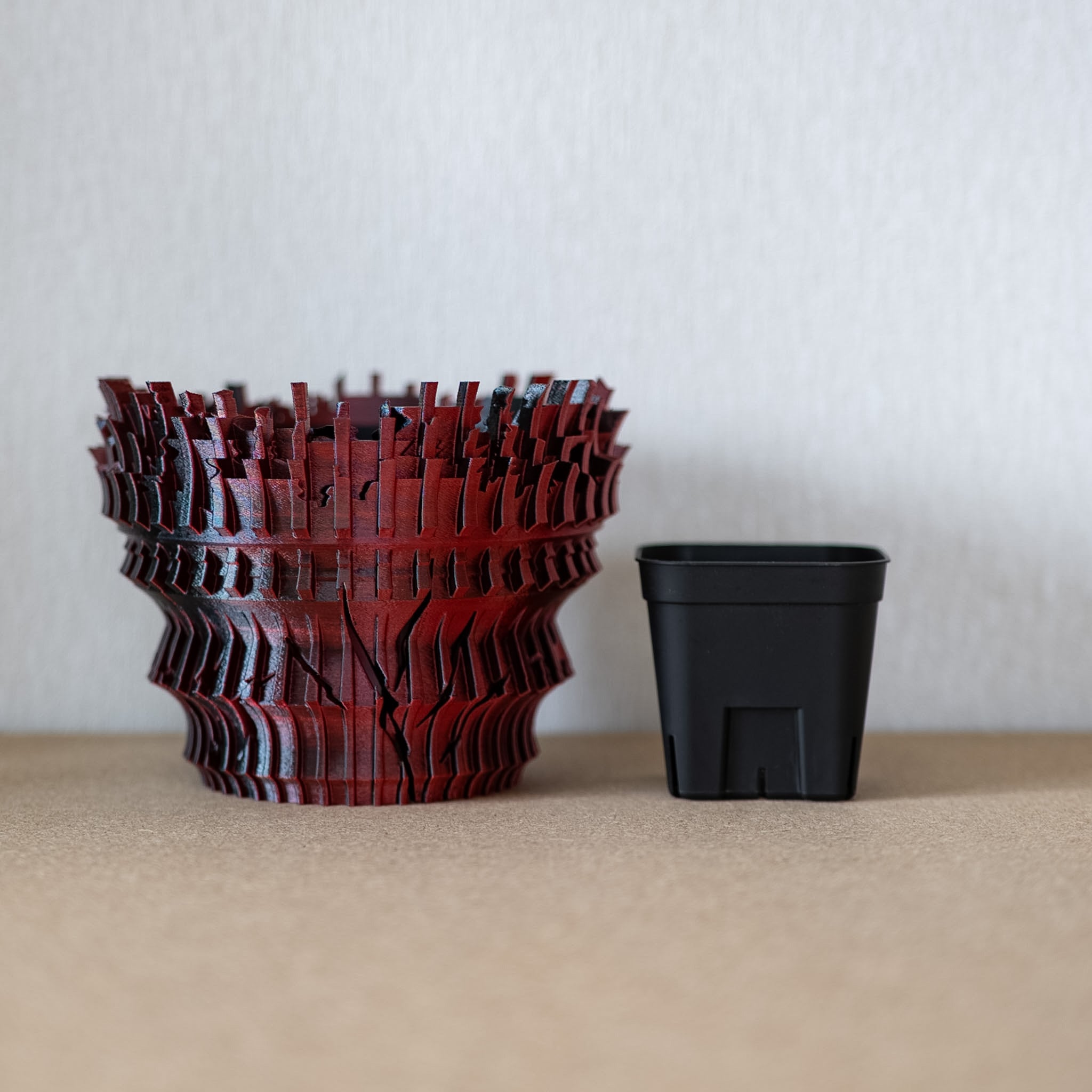 陶器鉢のような不規則性と3Dプリンターならではの精密なディテールを融合。全面スリットとサークリング防止のリブを設け、視覚的な美しさと優れた機能性を実現しています。