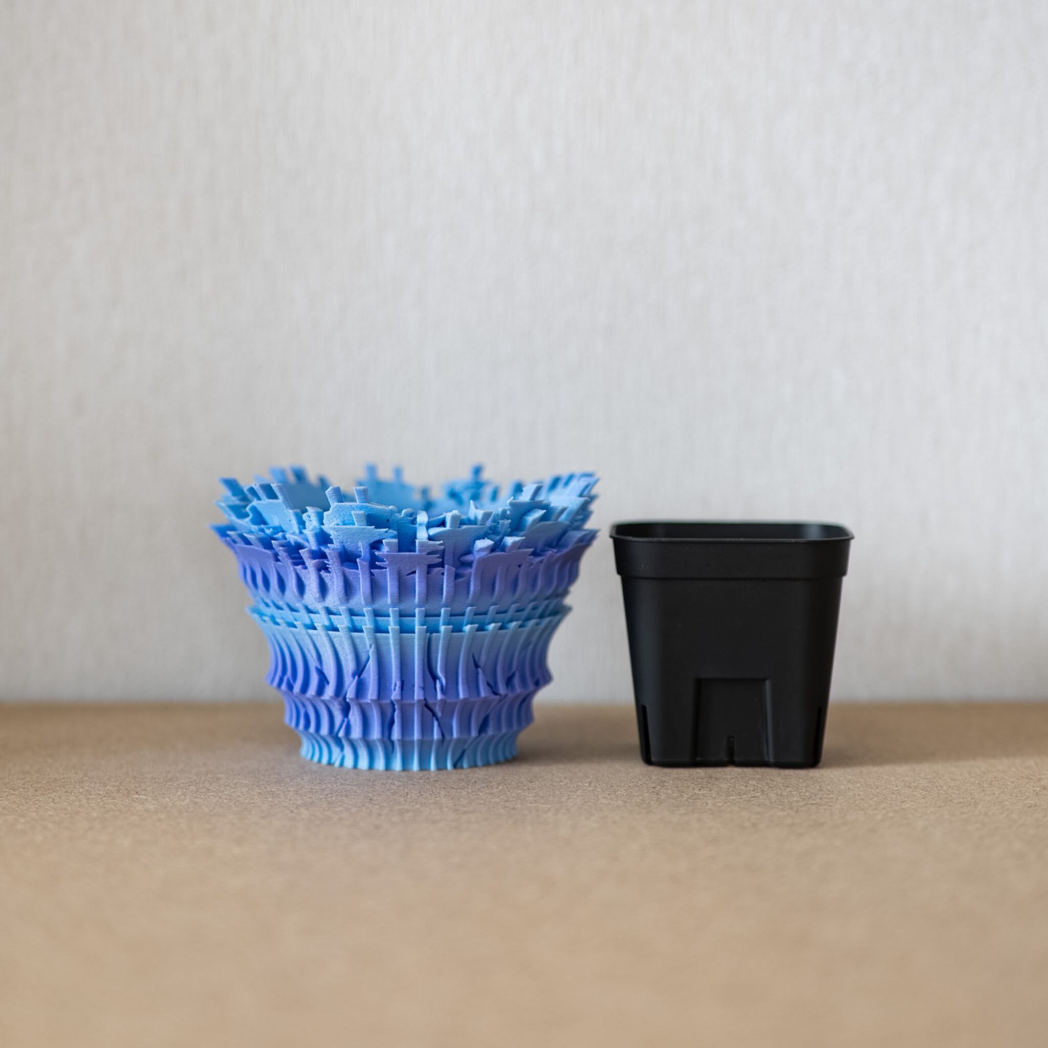 陶器鉢のような不規則性と3Dプリンターならではの精密なディテールを融合。全面スリットとサークリング防止のリブを設け、視覚的な美しさと優れた機能性を実現しています。