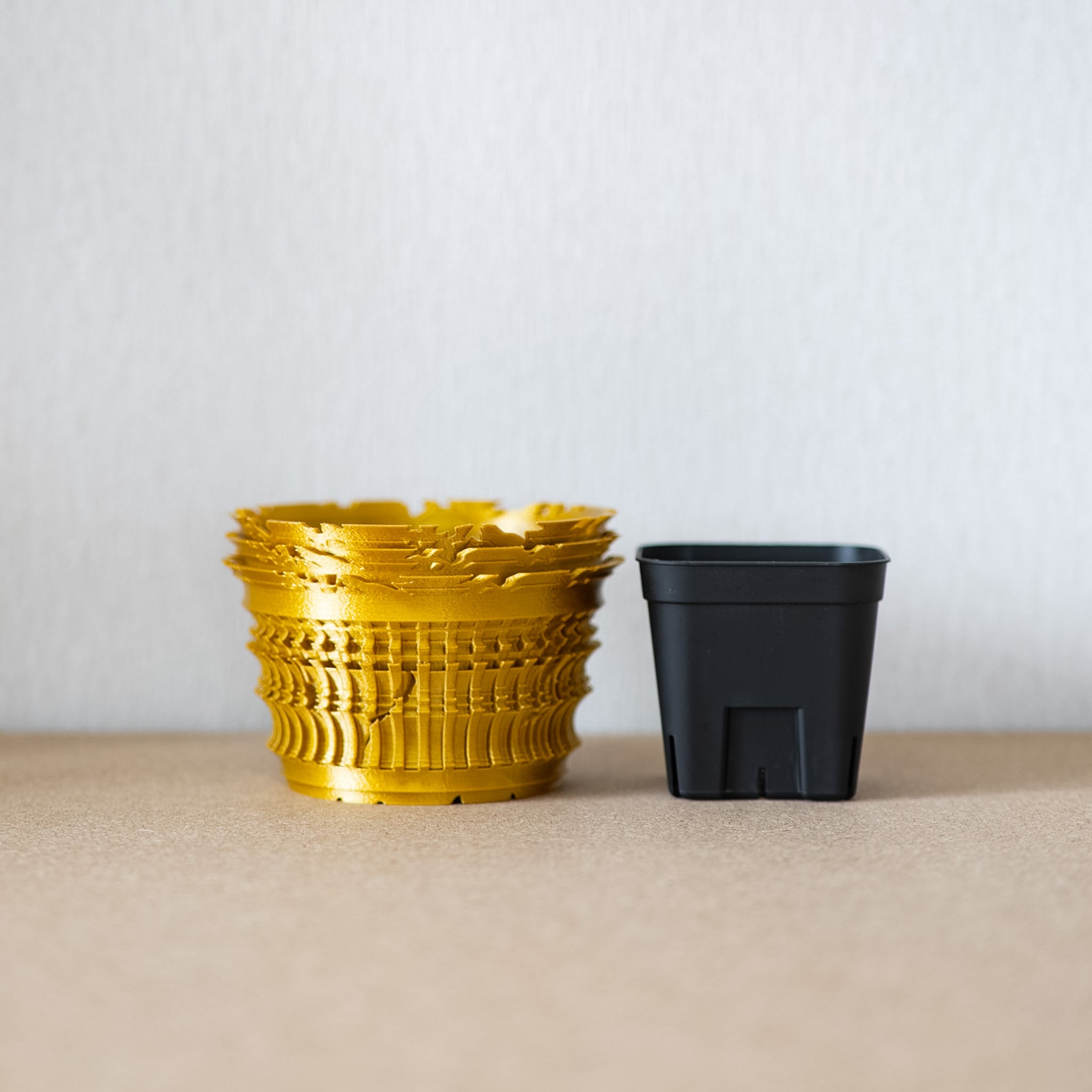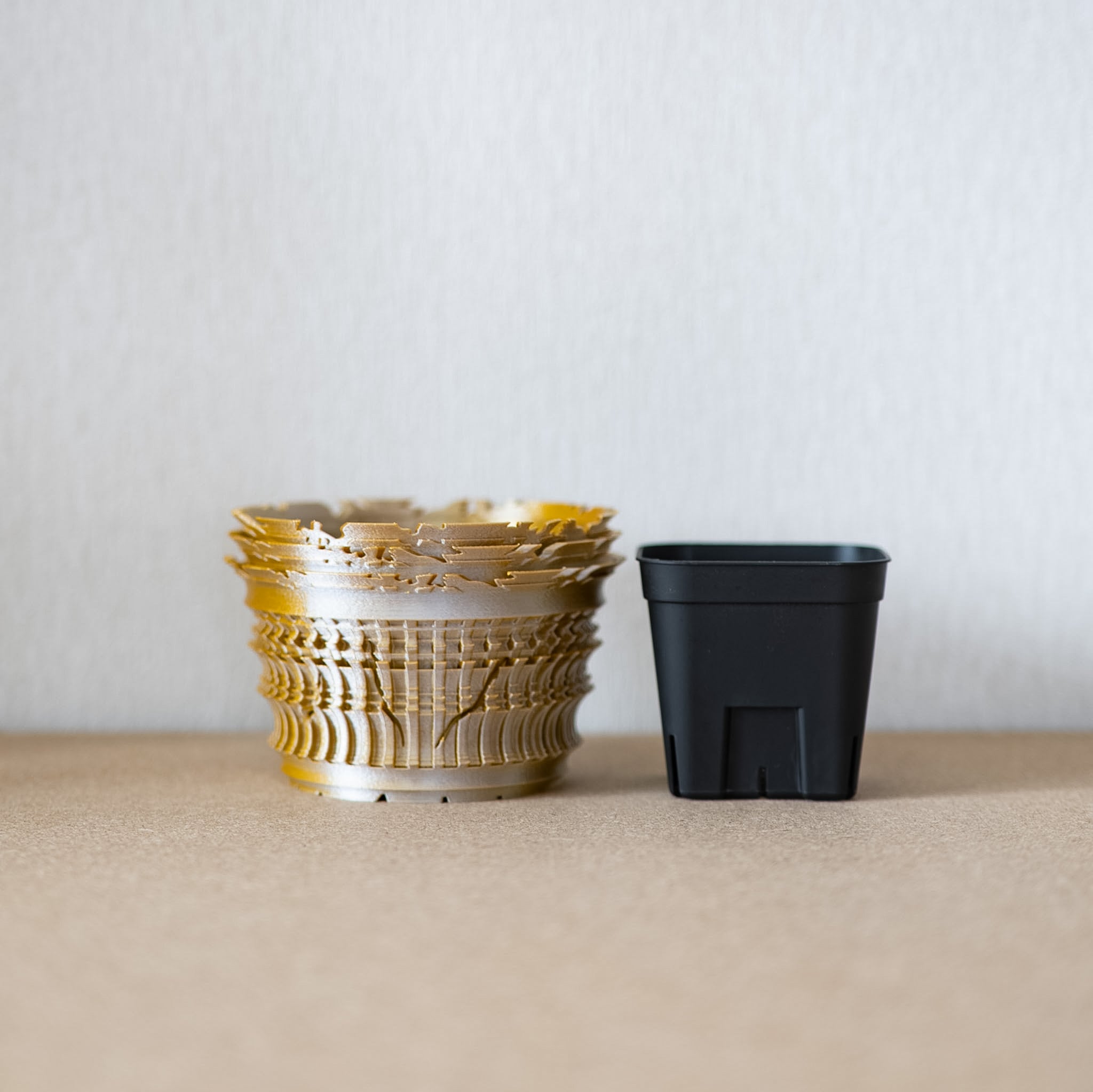 陶器鉢のような不規則性と3Dプリンターならではの精密なディテールを融合。全面スリットとサークリング防止のリブを設け、視覚的な美しさと優れた機能性を実現しています。