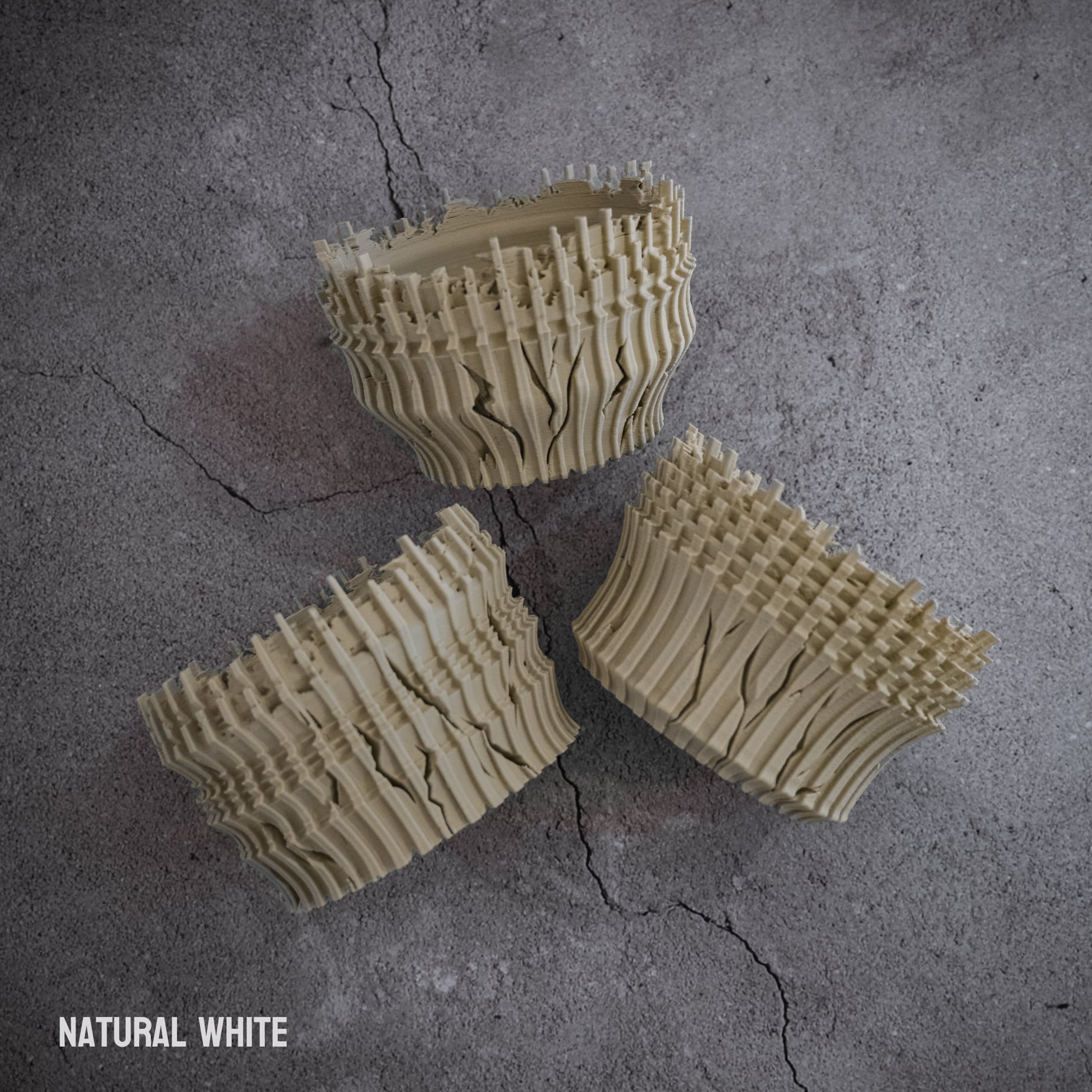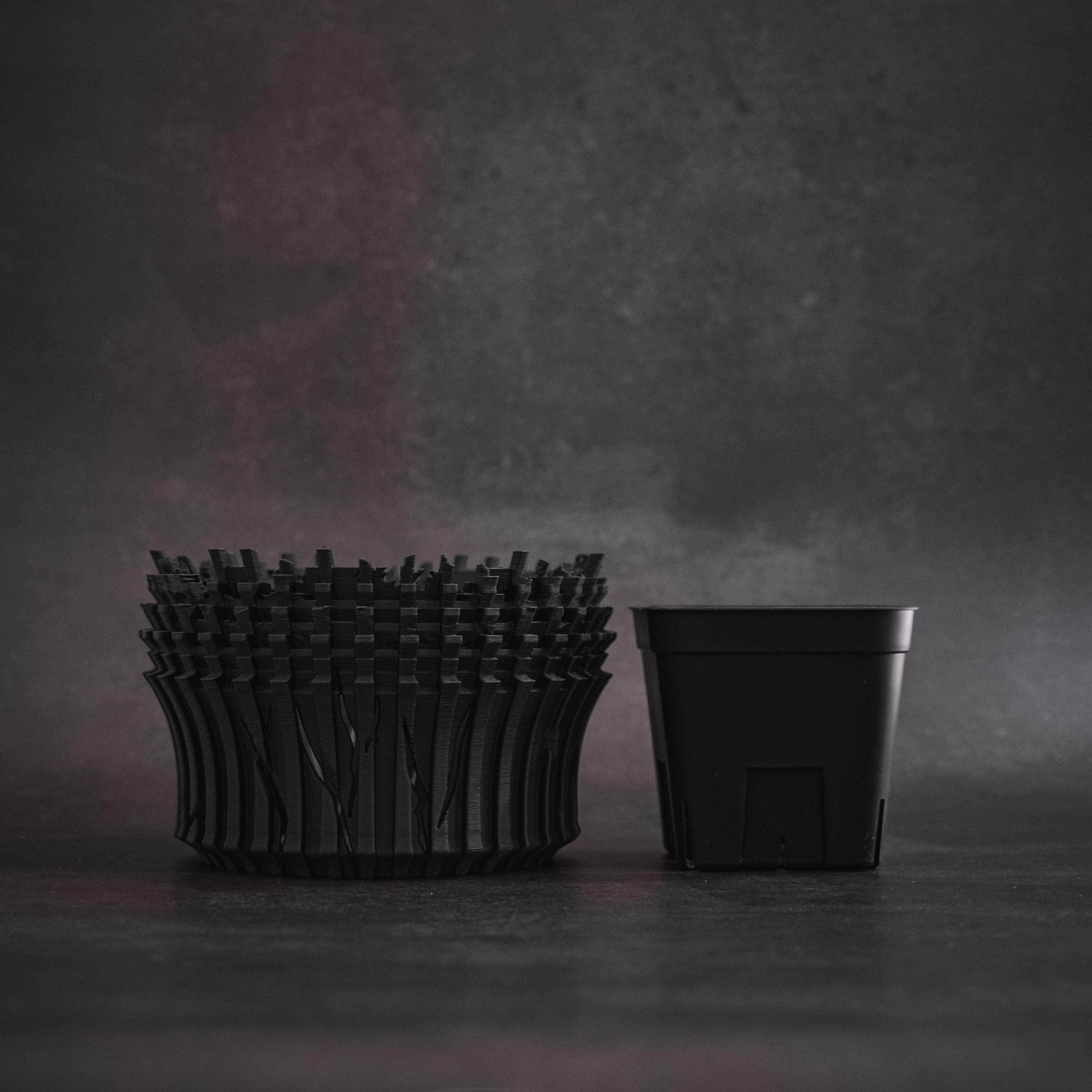 陶器鉢のような不規則性と3Dプリンターならではの精密なディテールを融合。全面スリットとサークリング防止のリブを設け、視覚的な美しさと優れた機能性を実現しています。